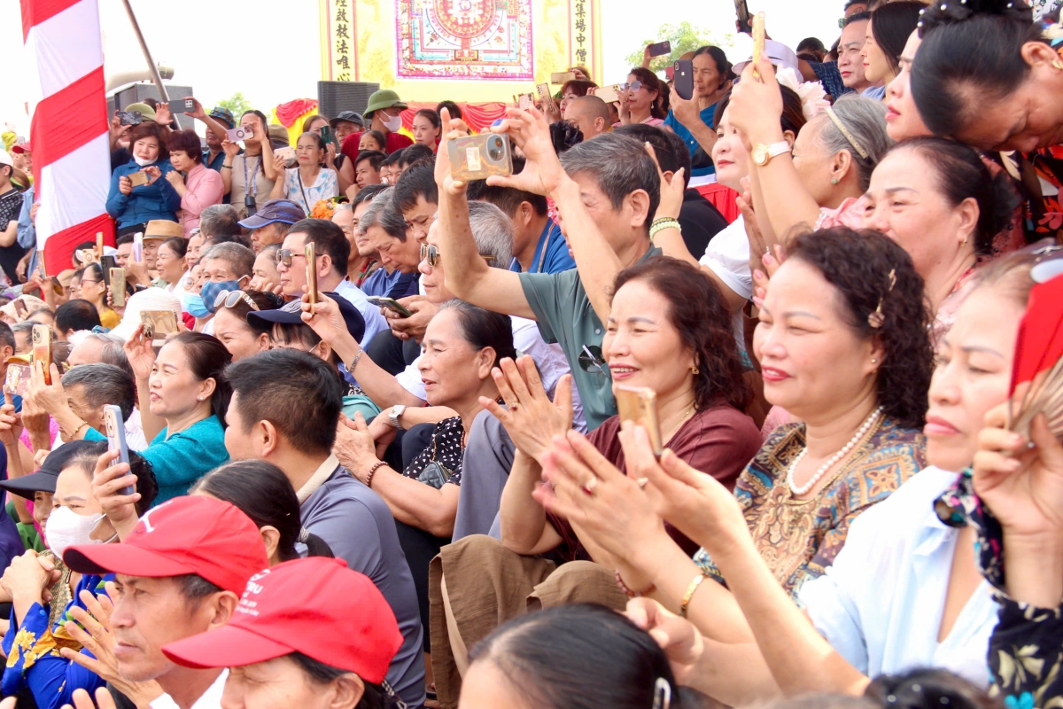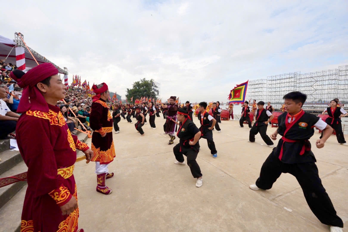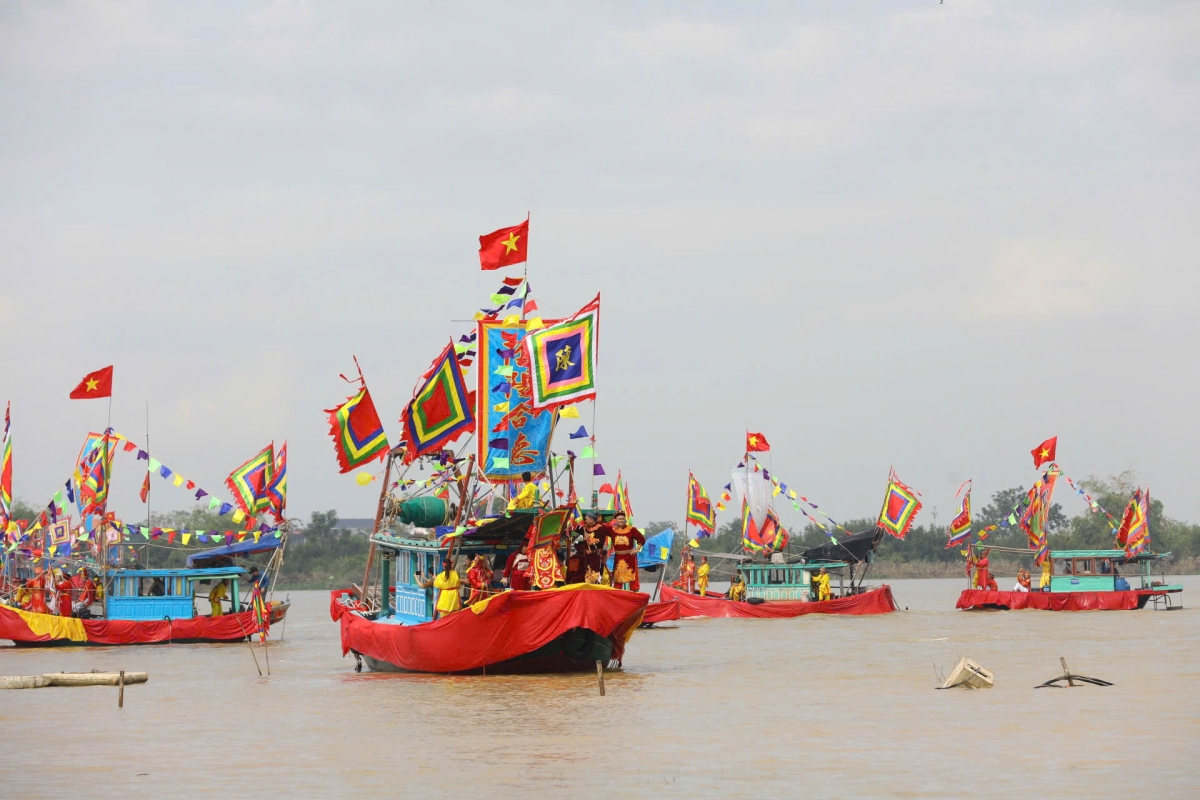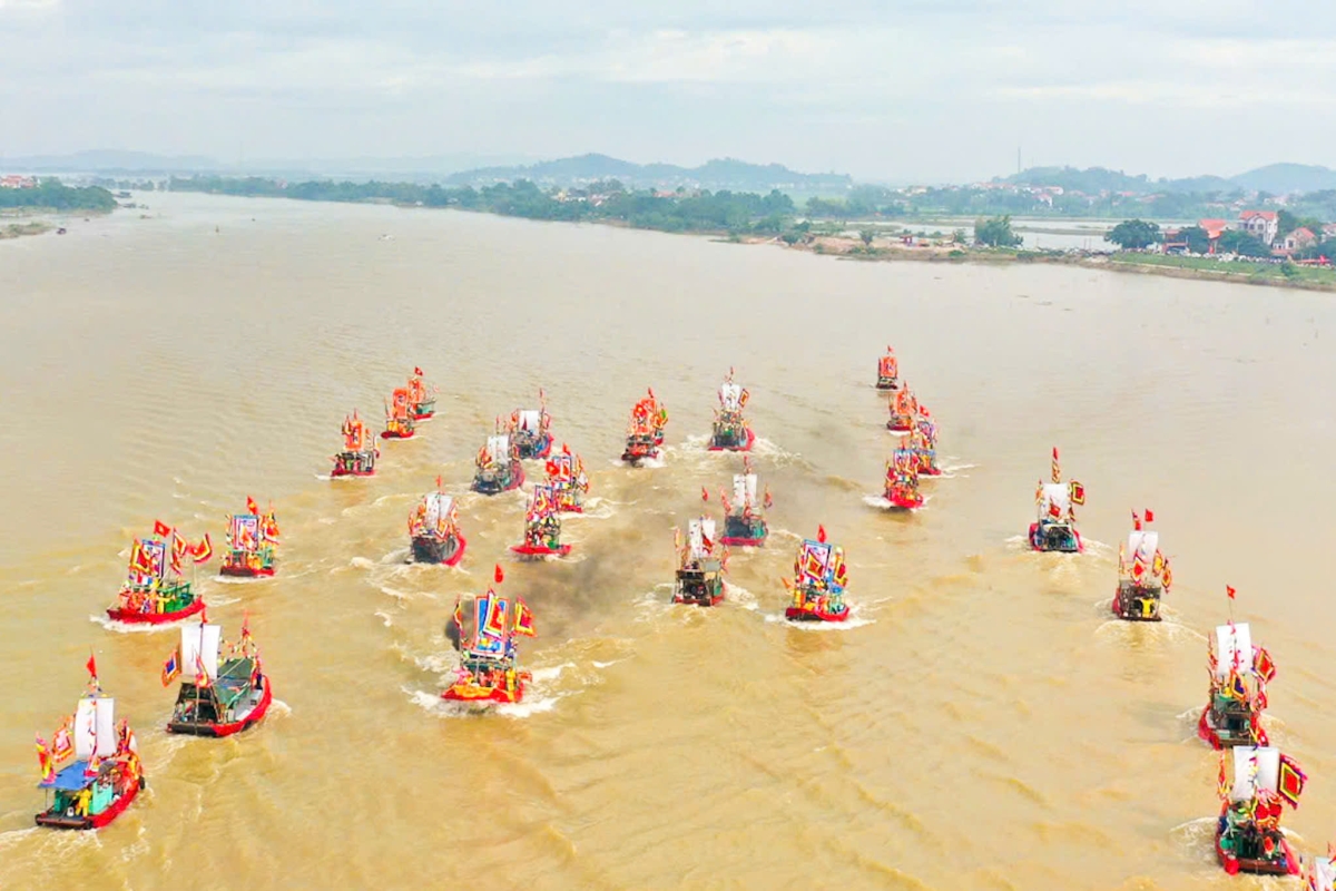 Các đoàn thuyền chiến lướt sóng dưới sông trong tiếng trống, tiếng reo hò vang dậy.