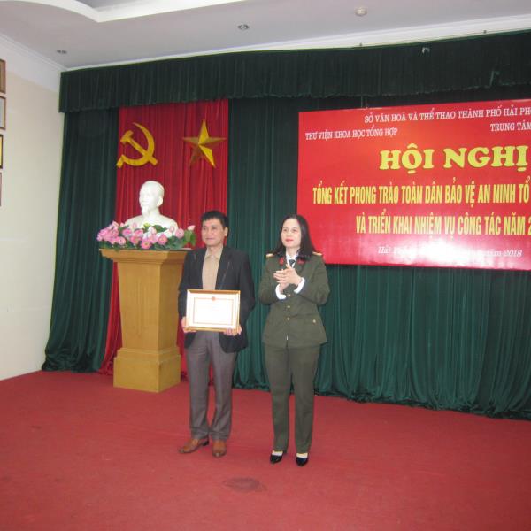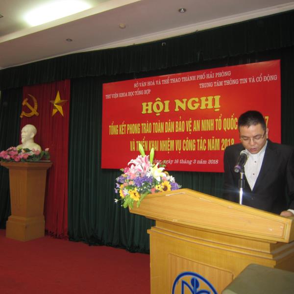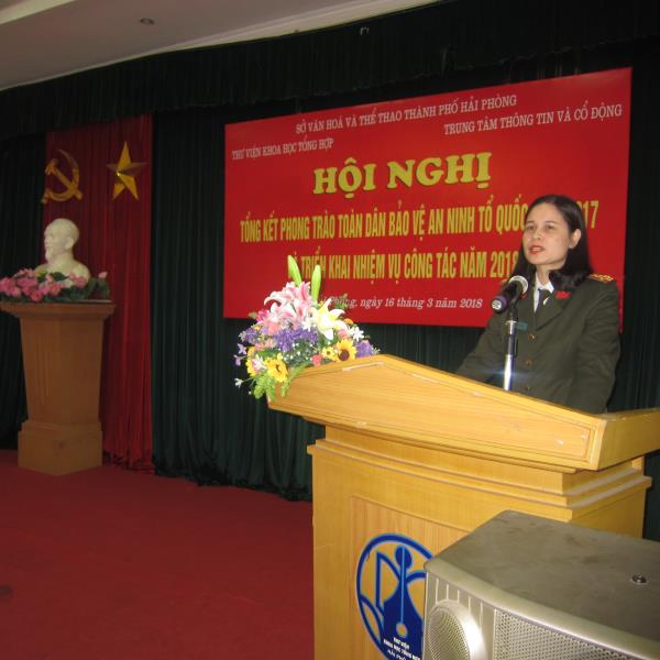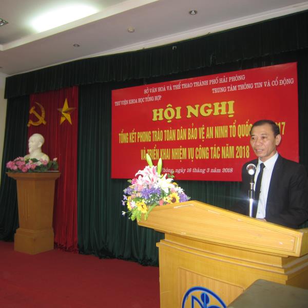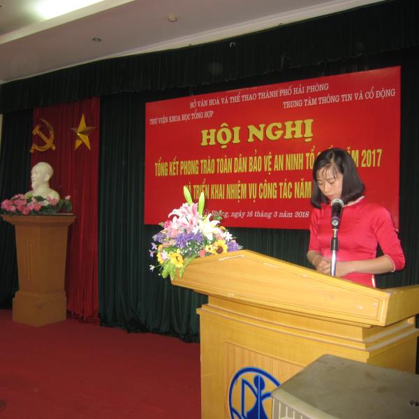 Sáng ngày 16 tháng 3 năm 2018 Thư viện Khoa học Tổng hợp và Trung tâm Thông tin và Cổ động thành phố Hải Phòng tổ chức Hội nghị Tổng kết công tác phong trào toàn dân bảo vệ An ninh tổ quốc năm 2017 và phát động phong trào thi đua năm 2018. Đến với hội nghị có đồng chí Thượng tá Mai Thị Phương Hà – Phó trưởng phòng PV28, đồng chí Thượng tá Nguyễn Thanh Hải – Phó trưởng phòng PA83, đồng chí Nguyễn Mạnh Cường - Trưởng Công an phường Đổng Quốc Bình, đồng chí Vũ Văn Tuấn - Giám đốc Thư viện Khoa học Tổng hợp Hải Phòng, đồng chí Đào Đình Thắng – Giám đốc Trung tâm Thông tin và Cổ động thành phố Hải Phòng, đại diện Ban chỉ huy đội phòng phong trào Cơ quan doanh nghiệp, đội tuyên truyền phòng PX15, báo An ninh Hải Phòng cùng toàn thể cán bộ công chức, viên chức, người lao động của Thư viện Khoa học Tổng hợp và Trung tâm Thông tin và Cổ động thành phố Hải Phòng.
