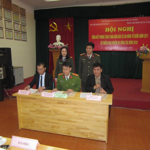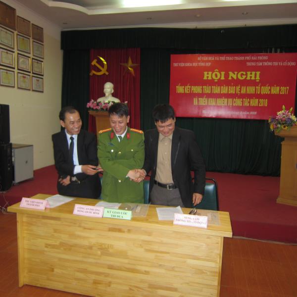 Hội nghị đã nghe báo cáo tổng kết Công tác xây dựng phong trào Toàn dân bảo vệ An ninh Tổ quốc năm 2017 và các tham luận của hai đơn vị. Năm qua, hai đơn vị tiếp tục phát huy vai trò, thực hiện tốt nhiệm vụ được phân công về việc đẩy mạnh phong trào toàn dân bảo vệ an ninh Tổ quốc gắn với thực tiễn, nghiêm túc chấp hành các giao ước đã kí kết và không để xảy ra sự vụ vi phạm nào tại đơn vị. Động viên kịp thời các cá nhân làm tốt, cá nhân phát hiện các tiêu cực, phát hiện các tư tưởng xấu có ảnh hưởng tiêu cực đến diễn biến tâm lý của cán bộ, viên chức, người lao động và nhân dân. Tại hội nghị ba đơn vị Thư viện Khoa học Tổng hợp Hải Phòng, Trung tâm Thông tin và Cổ động và Công an Phường Đổng Quốc Bình đã kí kết giao ước thi đua khép lại một buổi làm việc thành công.