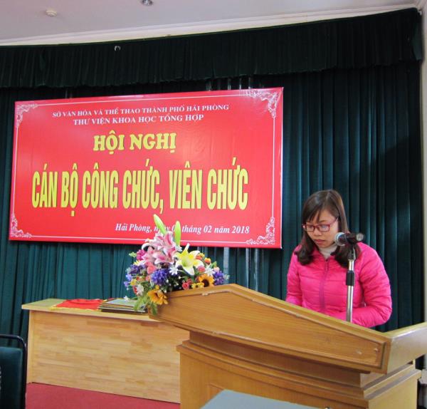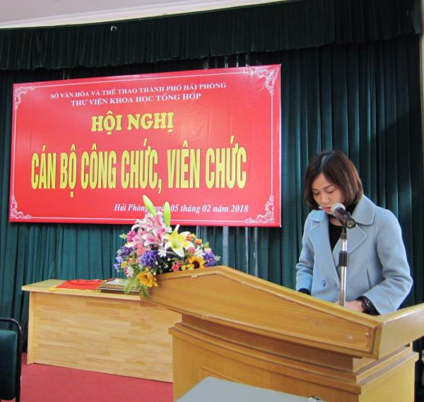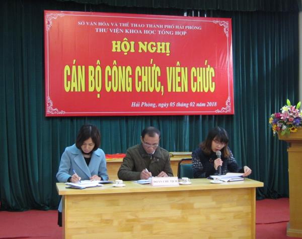 Ngày 05/02/2018, Thư viện Khoa học Tổng hợp Hải Phòng (KHTH) đã tổ chức Hội nghị Tổng kết Cán bộ, công chức, viên chức năm 2018. Hội nghị đã thảo luận, đánh giá trung thực, sâu sắc về những kết quả đạt được cũng như các tồn tại, hạn chế năm công tác vừa qua và đề ra phương hướng, nhiệm vụ năm 2018.
