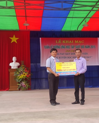Nhận thức được tầm quan trọng của việc học tập suốt đời trong cộng đồng, với mong muốn giới thiệu cho các em học sinh và thầy cô giáo một địa chỉ tin cậy trong việc học tập và nghiên cứu. Ngày 2/10/2015 Thư viện Khoa học Tổng hợp Hải Phòng đã tham gia gian trưng bày sách tại lễ khai mạc “ Tuần lễ hưởng ứng học tập suốt đời ” do Sở Giáo dục & Đào tạo Hải Phòng và Hội Khuyến học thành phố phối hợp tổ chức tại trường Trung học Phố thông Lê Quý Đôn.